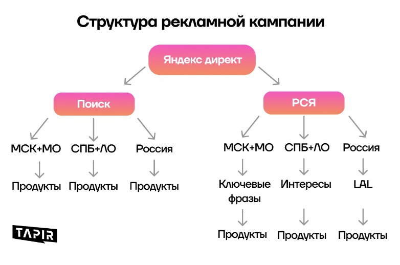 На старте было принято решение использовать поисковые кампании по каждому из продуктов.